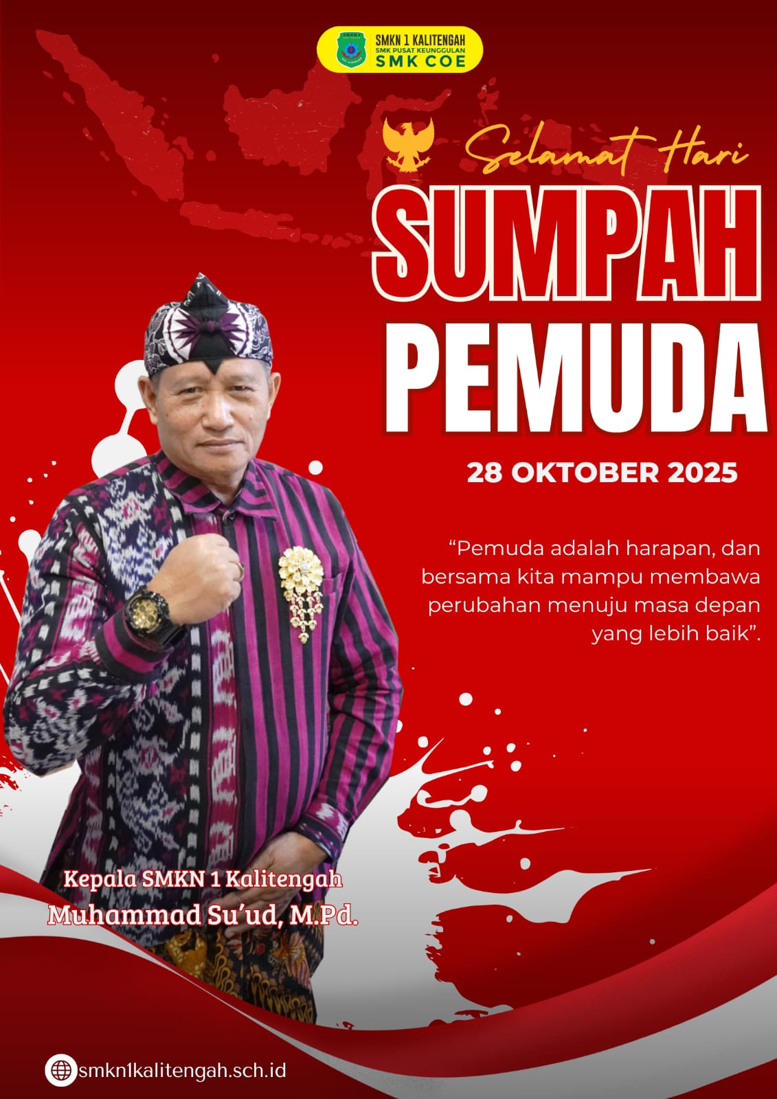 Pada hari Senin, 28 Oktober 2025, seluruh civitas akademika SMKN 1 Kalitengah memperingati Hari Sumpah Pemuda dengan penuh semangat nasionalisme. Kegiatan ini diikuti oleh guru, tenaga kependidikan, serta seluruh siswa dari kelas X, XI, dan XII, yang hadir di halaman sekolah untuk mengikuti upacara bendera.