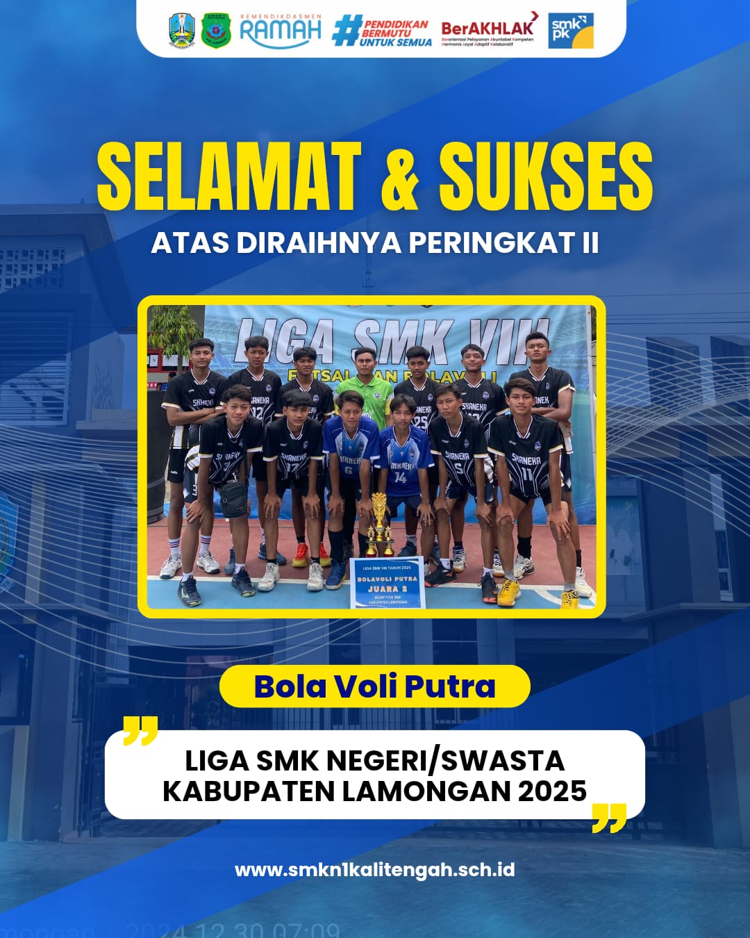 Dengan penuh rasa bangga, kami ucapkan selamat kepada Tim Bola Voli Putra yang telah berhasil meraih Peringkat II dalam ajang Liga SMK Negeri/Swasta Kabupaten Lamongan 2025. Prestasi ini merupakan bukti nyata dari kerja keras, kedisiplinan, serta semangat juang tinggi seluruh pemain, pelatih, dan tim pendukung.