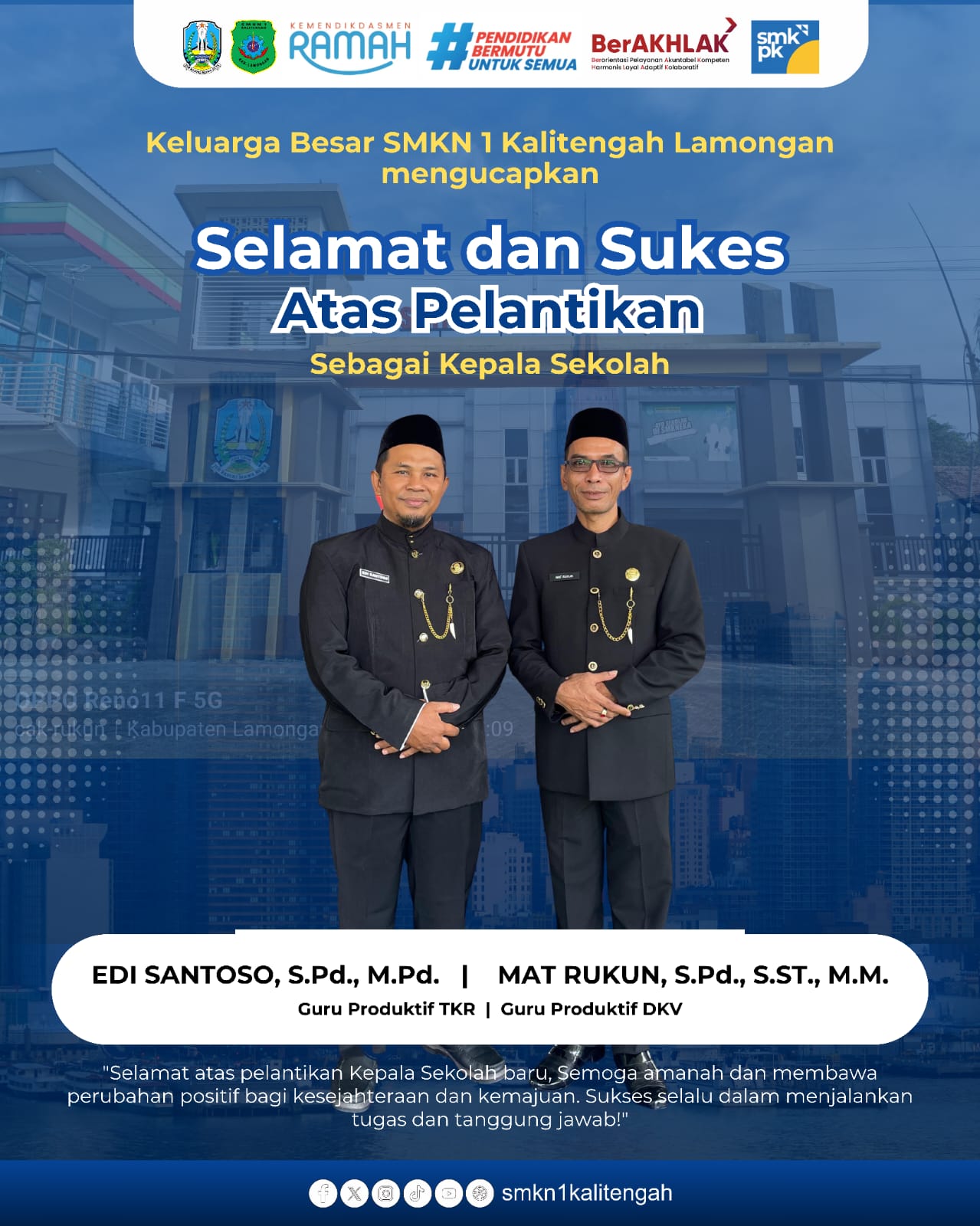 Keluarga Besar SMKN 1 Kalitengah Lamongan mengucapkan Selamat dan Sukses atas pelantikan