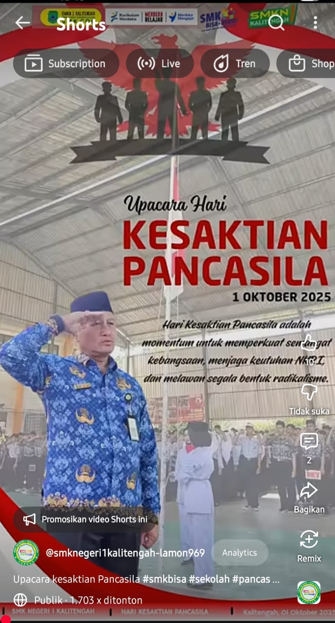Dalam sambutannya, beliau menyampaikan bahwa Hari Kesaktian Pancasila bukan sekadar peringatan seremonial, tetapi momentum untuk merefleksikan semangat persatuan, gotong royong, dan cinta tanah air. Beliau juga mengingatkan bahwa generasi muda, khususnya siswa SMKN 1 Kalitengah, harus menjadi pelopor dalam menjaga keutuhan bangsa dengan cara menolak segala bentuk radikalisme, intoleransi, dan penyalahgunaan teknologi digital.